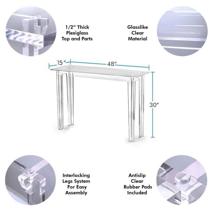 Our classic acrylic console table provides a balance of style and function. This contemporary console table is a perfect choice for any living room, dining room, or entryway. Its sleek, modern design and clear acrylic construction make it an eye-catching addition to any space. The console is versatile enough to fit in with different types of décor, while its sturdy construction ensures it will last for years.