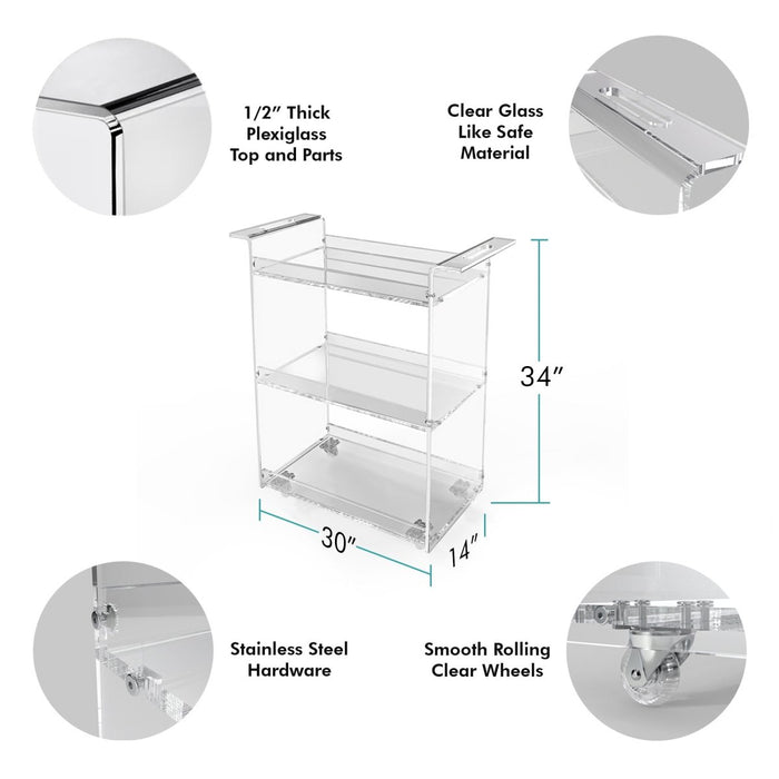 Go sleek and modern with an acrylic bar cart that can easily wheel from cocktail hour in the Dining room to a night cap in the Living room. This three shelf design allows you to safely transport your bottles, glasses, ice and all of your cocktail’s garnishments with ease. Permanently display your spirits in style while allowing versatility, cleanability and portability!
