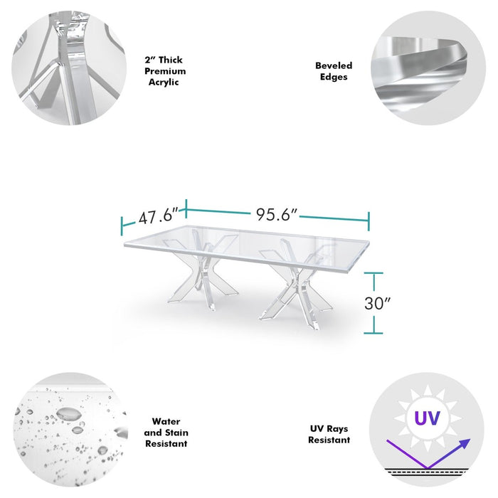 Brighten your dining experience and bring awe to the eyes of your guests with this one of a kind acrylic masterpiece. Our clear acrylic Arctic Table will enlarge the visual impression of its surroundings, creating the perception of more space. With an optical transparency at least 10 times that of glass, our premium acrylic table is embellished with a polished chamfered edge to optimize crystalline reflectivity in natural light. The edges of the table top will be clear and bright, matching the luminescence of the acrylic base. Bring more transparency into your life with a conversation piece that not only enhances your space, but brightens the mood by letting you see more of the ones you love.