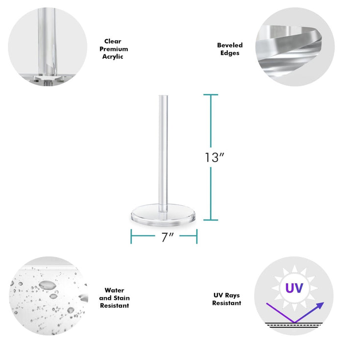 An acrylic paper towel holder for the aspiring minimalist who wants to clear the clutter from their countertops. It's a timeless and classy towel holder that provides a subtle elegance to your home and disappears into the background when not in focus. Polished acrylic not only looks fantastic, but is rust proof and stain resistant. Fingerprints don't show and are easy to wipe off. It will not scratch any countertop or table top surface, weather granite, glass, or even wood. The thicker, heavier base provides good stability when pulling and tearing.