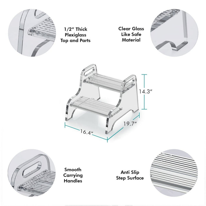 This clear acrylic two step stool is the perfect addition to any home. It is made of high-quality acrylic that is durable and easy to clean. The stool has two steps that provide plenty of height for reaching high shelves, changing light bulbs, or simply getting a little extra boost. The clear acrylic allows the stool to blend in with any décor, making it a stylish and functional addition to any room.