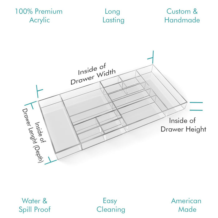 I bought this organizer to fit into a very shallow make up table. I love that I could create a custom sized unit. I was surprised of the quality when it came as it is a very heavy, sturdy acrylic. It fit perfectly into the drawer and even came with little pads for the bottom to keep it from sliding.