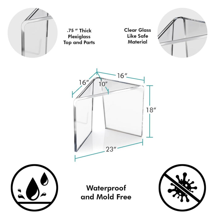 This sleek corner stool is the ideal space conscious seat or storage area for a modern shower. Our premium clear acrylic is ideal for the bathroom and shower environment, able to withstand regular attacks from hot water and bathroom chemicals. There are no issues involving rust, yellowing, or rot as with some other materials, so this naturally mold resistant acrylic will remain crystal clear for decades.