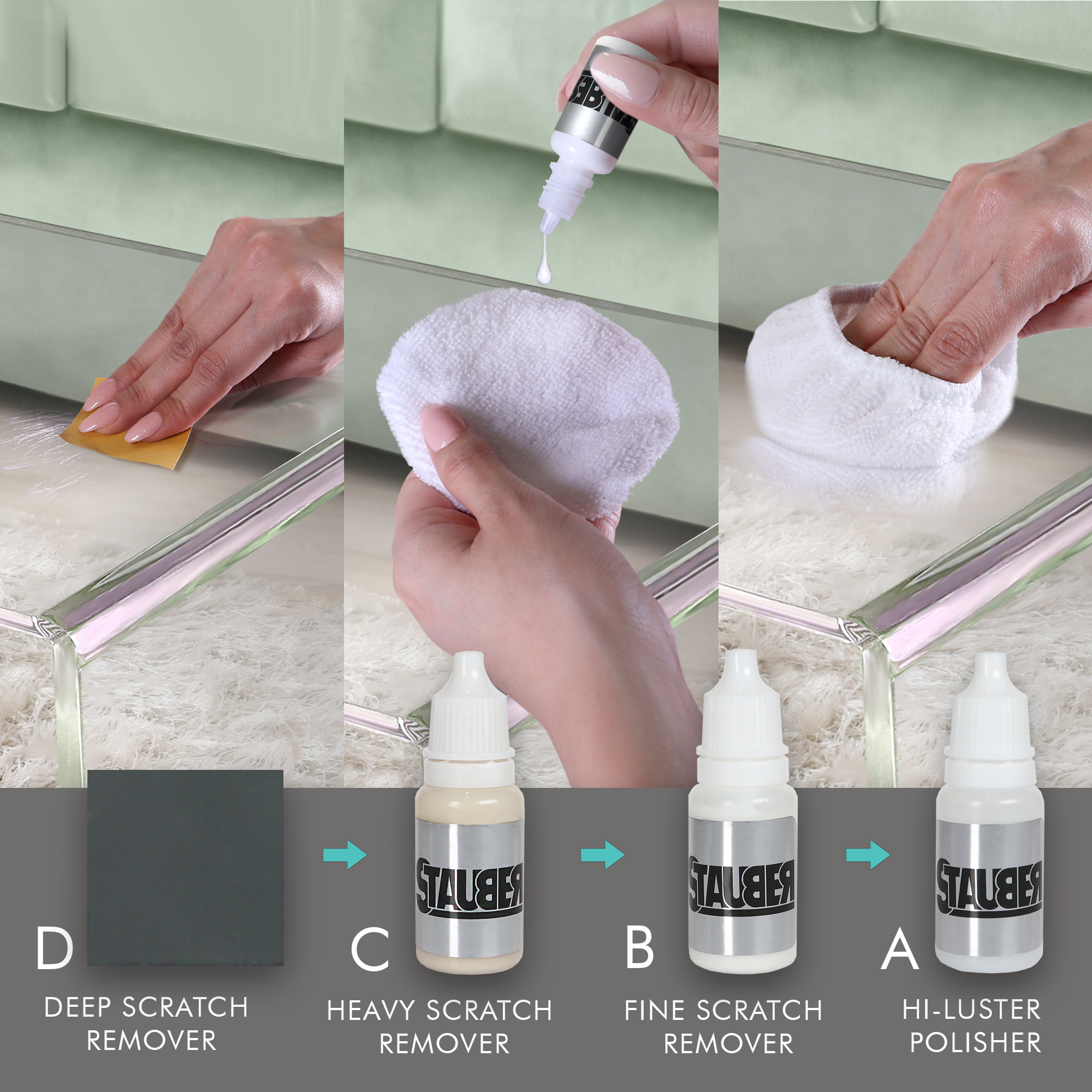 Erase light scratches with the Fine or Heavy scratch remover paste. For, deeper scratches, use the Deep Scratch Remover. Always follow up with Fine and Hi-Luster to achieve that perfect mirror shine!