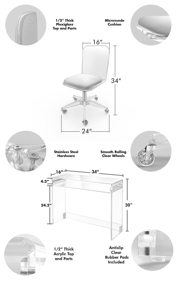 This is the original Waterfall Desk from STAUBER Furnishings. Our product is handcrafted in Hollywood, FL. Smooth and minimalist, this elegant piece is sure to bring some unique beauty to the room. Our premium clear acrylic with the highest optical clarity will provide the sensation of a brighter more open space. It's a perfect writing desk or vanity that assembles easily with polished stainless steel fasteners. Our glue-free design ensures it will endure many years of regular use. Pair it with our clear office chair or vanity chair for the perfect writing desk or vanity table set.